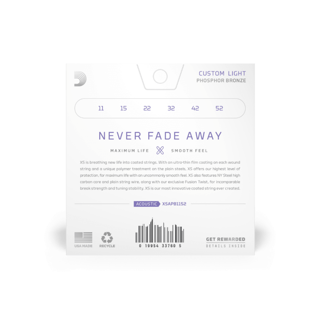 XS is breathing new life into coated strings. With its ultra-thin film coating on every wound string and a unique polymer treatment on the plain steels, XS offers our highest level of protection, for maximum life with an uncommonly smooth feel. XS also features NY Steel high carbon core and plain string wire, along with our exclusive Fusion Twist, for incomparable break strength and tuning stability. XS is the most innovative coated string ever created.