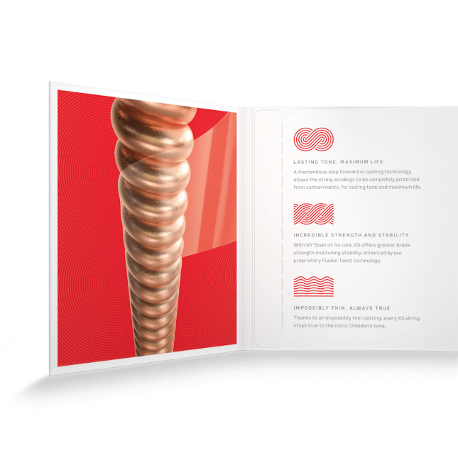 XS is breathing new life into coated strings. With its ultra-thin film coating on every wound string and a unique polymer treatment on the plain steels, XS offers our highest level of protection, for maximum life with an uncommonly smooth feel. XS also features NY Steel high carbon core and plain string wire, along with our exclusive Fusion Twist, for incomparable break strength and tuning stability. XS is the most innovative coated string ever created.