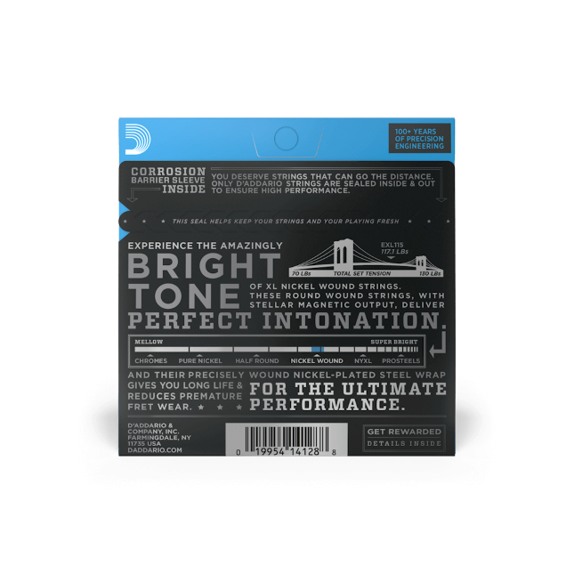 XL Nickel Wound electric guitar strings are the standard against which all other strings are measured. D'addario's best-selling electric set, XL Nickel has been revered by players everywhere since 1974. Made with a high carbon steel core and nickel-plated steel wrap wire, XL Nickel strings have a bright, versatile tone, ideal for a wide variety of musical styles. 11-49 Medium gauge sets provide increased volume, with slightly more tension and resistance.