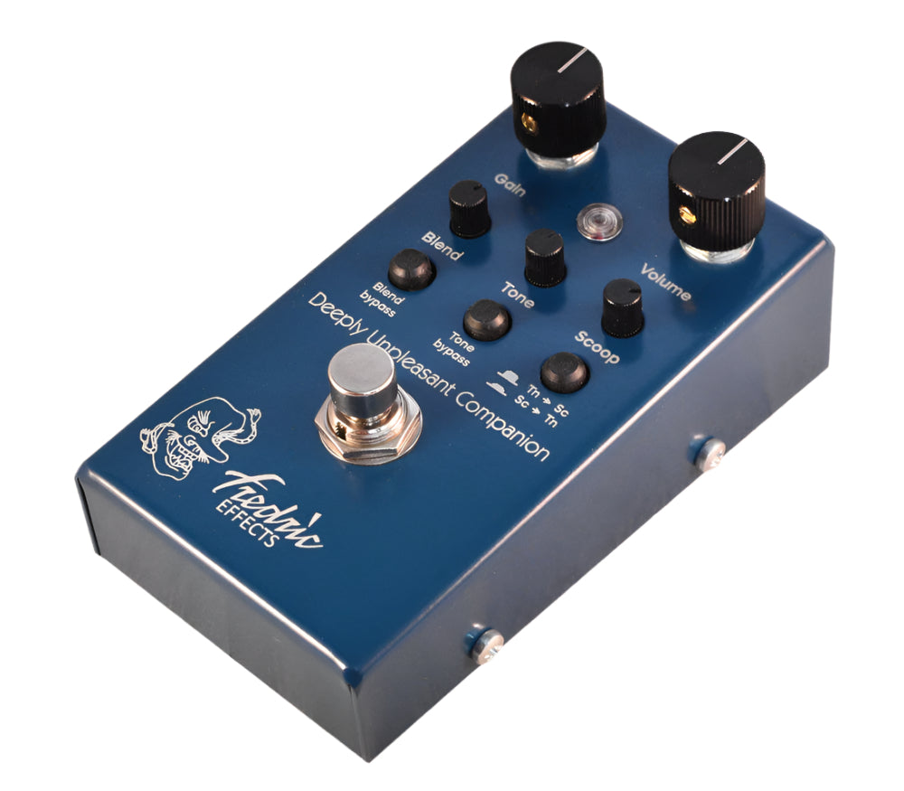 The MkII Deeply Unpleasant Companion adds gain, tone and mid-scoop controls. Below these are a series of push-buttons to allow the tone and blend circuits to be bypassed completely, along with a further button to switch the order of the tone and scoop circuits. The result of which is a truly versatile fuzz with endless opportunities for sonic experimentation.