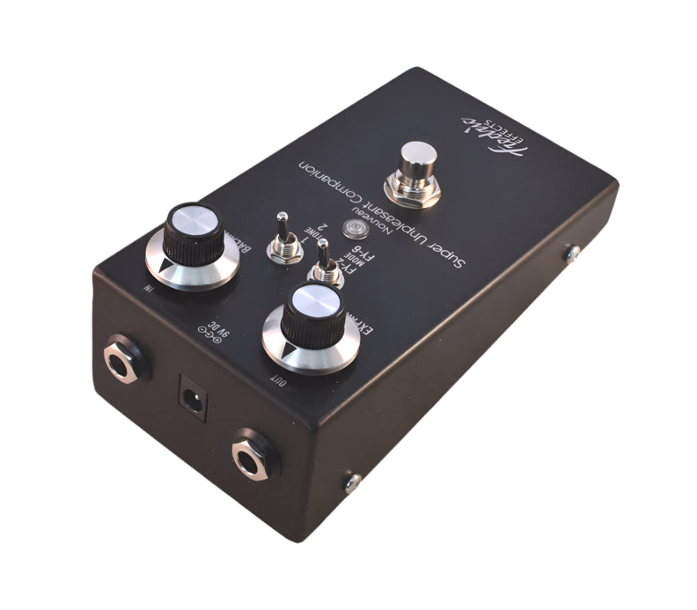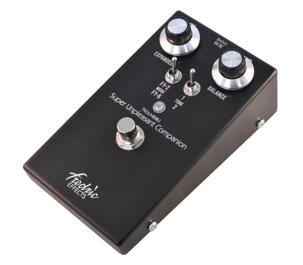 The Fredric Effects Nouveau Super Unpleasant Companion is a combined Shin-Ei FY-2 and FY-6 Superfuzz clone in a custom enclosure which is slightly smaller than our Classic Super Unpleasant Companion. It features top-mounted jacks and has the controls on the front face.