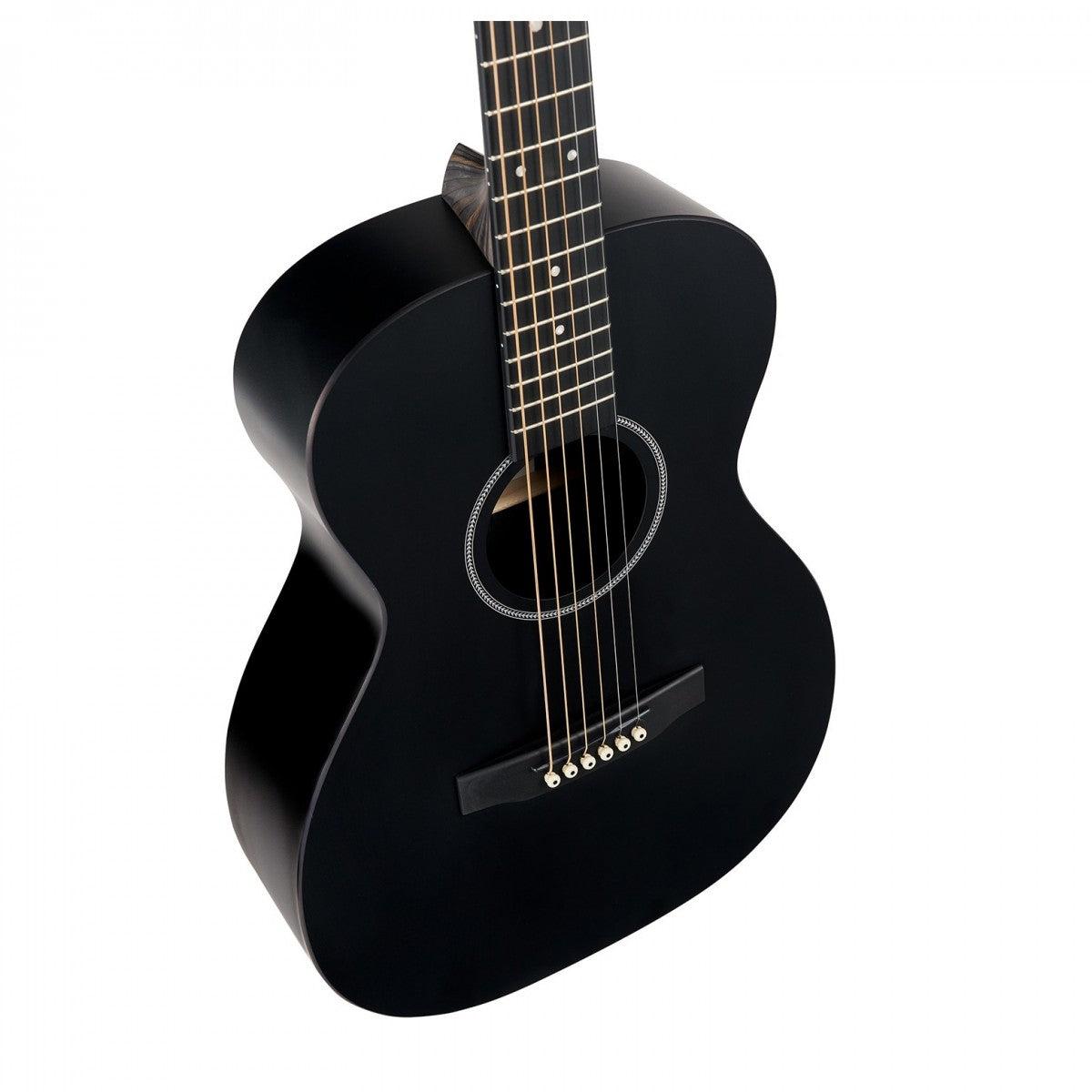 The 0-X1 Black is an affordable acoustic Concert model available in a striking all-black colorway. The body's top, back, and sides are made of high-pressure laminate (HPL), a durable material that doesn't sacrifice the classic Martin tone you know and love. This sleek, special addition to the X Series lineup includes playability enhancements like a thinner fingerboard with a gently beveled comfort edge and refined string spacing, and a modernized bridge contour for a smooth and comfortable playing experience. Concert models are the smallest full-sized guitars in the Martin lineup, providing clear, crisp trebles with delicate bass, perfect for fingerstyle playing and genres that require precise and clear note definition, while also being versatile enough to make for a great strummer. It also features chrome closed gear tuning machines, a birch laminate neck with Richlite® fingerboard, and a herringbone pattern around the rosette. All X Series models come with a softshell case.